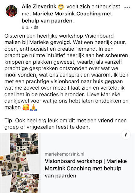 Via via kende ik Marieke en op die manier bij haar terecht gekomen voor onder ander een coachingssessie. Privé liep ik door een nare ervaring uit het verleden tegen een obstakel aan. Marieke heeft mij gecoacht, we hebben opdrachten gedaan en veel gepraat. Tijdens de sessie hebben we realistische stappen kunnen zetten. Ik raad Marieke aan, ze heeft veel rust, is geduldig en heeft mij fijn gecoacht!